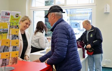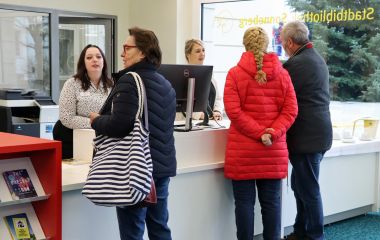 Nach zweimonatiger Bauzeit ist die Bibliothek seit dem 15. November 2024 wieder wie gewohnt an sechs Tagen die Woche geöffnet. Nutzer dürften den Eingangsbereich an der Stirnseite des Rathauses kaum wiedererkennen. Ob mit Kinderwagen, Rollator oder Rollstuhl – barrierefrei kommt man nun über eine automatische Schiebetür herein und trifft gleich im Anschluss auf die neue Ausleihtheke mit zwei Arbeitsplätzen für die Mitarbeiterinnen. Neben einem frischen Anstrich und optimierter Beleuchtung wurde ein kleiner Aufenthaltsbereich geschaffen, wo es sich gemütlich Schmökern lässt.