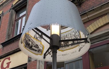 Historische Fotos aus der Blütezeit der Spielzeugproduktion in Sonneberg verstecken sich im Lampenschirm, der abends beleuchtet wird. Wie hat die Bahnhofstraße in diesem Bereich früher ausgesehen? Wie lief die Puppenherstellung ab? Zumindest einen kleinen Eindruck kann man sich hier anhand des Bildmaterials und der Illustrationen verschaffen. Oder man bleibt etwas länger, um einen Lesestopp direkt vor der Buchhandlung einzulegen. Noch nicht fertig, aber in Arbeit sind Informationen zu einer ganz besonderen Spielzeugerfindung aus dem 19. Jahrhundert, die in die Geschichte einging.