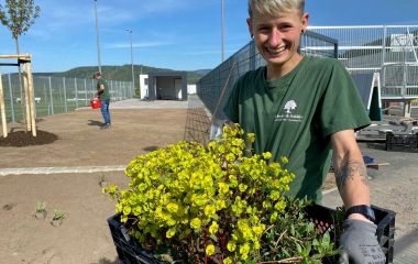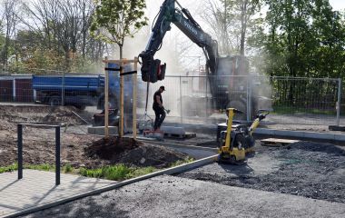 Der neue Pump-Track – ein kurvenreiche, hügelige Mountainbike-Strecke – ist frisch asphaltiert und muss noch entsprechend eingebettet werden. Der Bagger ist noch in Aktion, die Bauarbeiter setzen Randsteine und Zaunelemente und eine Gartenbaufirma pflanzt die bisher noch unangetasteten Flächen mit Stauden, Gräsern und Blumen an. Auf die Betonteile für die Kletterwand wird derzeit noch gewartet.