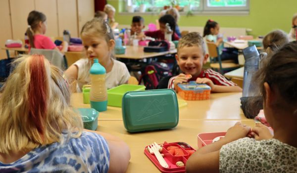Gleich am zweiten Schultag brachte Bürgermeister Dr. Heiko Voigt im Schulzentrum Wolkenrasen eine Charge der Brotdosen für die Erstklässler der Grund- und Förderschule vorbei. Dabei konnte in der Frühstückspause gleich geklärt werden, was die Kleinen so an Pausenversorgung dabei haben. „Wenn man Hunger hat, kann man ganz schlecht lernen“, gab der Bürgermeister den Mädchen und Jungen mit auf den Weg.