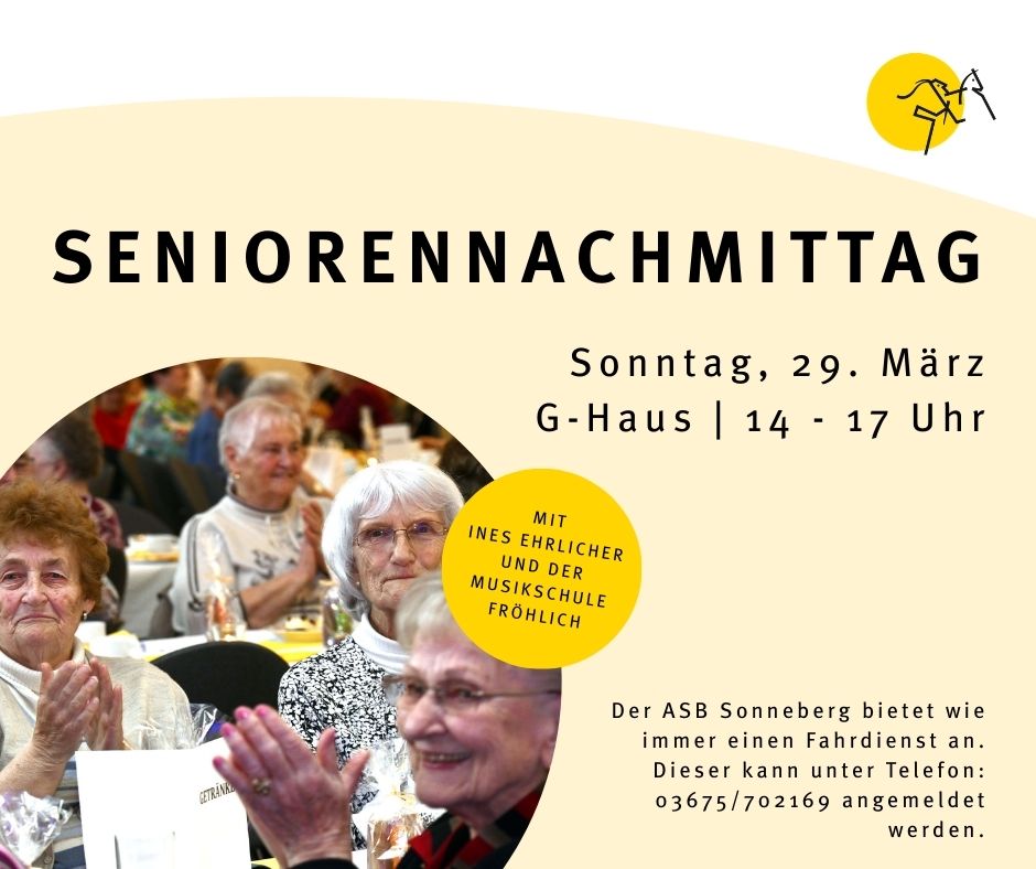 Der Bürgermeister und der Seniorenbeirat laden die Seniorinnen und Senioren der Stadt Sonneberg für Sonntag, 29. März 2026, um 14:00 Uhr in das Gesellschaftshaus Sonneberg zum Seniorennachmittag mit Kaffee und Kuchen ein.