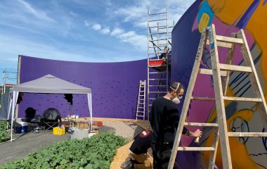 Während sich auf der nach außen gewölbten Seite, die Richtung Parkplatz und Café Isis zeigt, farbenfrohe wetterfeste Holz-/Kunststoffplatten aneinanderreihen, bekam die Innenseite im September gezielte Sprühstöße aus der Dose. Ein zuvor mit der Stadt Sonneberg abgestimmtes Graffito wurde von drei professionellen Sprayern aus dem Nachbarlandkreis Saalfeld-Rudolstadt angebracht. Eine knappe Woche waren Simon, Bert und Klemens vor Ort, um die Themen des Jugendareals zu verbildlichen.