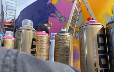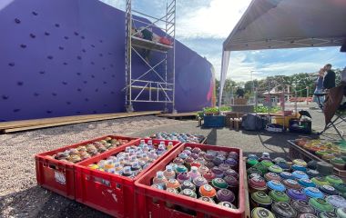 Nach der Farbgrundierung haben sie die zuvor entworfenen Bildelemente per Beamer an die Wand projiziert, um die Aufteilung und Umrisse und zu skizzieren. Während Simon eine fotorealistische Hand beim Klettern ausgefertigt hat, brachten Bert und Klemens die Formen und Farben der verschiedenen Sportarten auf den Beton. Rasend schnell war das Beton-Gemälde gewachsen. Die Spielzeugstadt setzt darauf, dass die aufwendige Arbeit der drei Sprayer dauerhaft Freude bei den Sonnebergern findet – vor allem bei den Nutzern des neuen Jugend- und Freizeitareals.