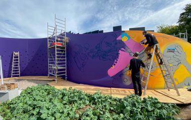 Für das im Juni dieses Jahres eröffnete Freizeitgelände AREAl26 ist in den vergangenen Wochen ergänzend eine große Kletterwand zum Bouldern entstanden. Nach der Installation der Betonteile und der Befestigung der Klettergriffe hat die graue Betonschale nun ein buntes Innen- und Außenleben erhalten.