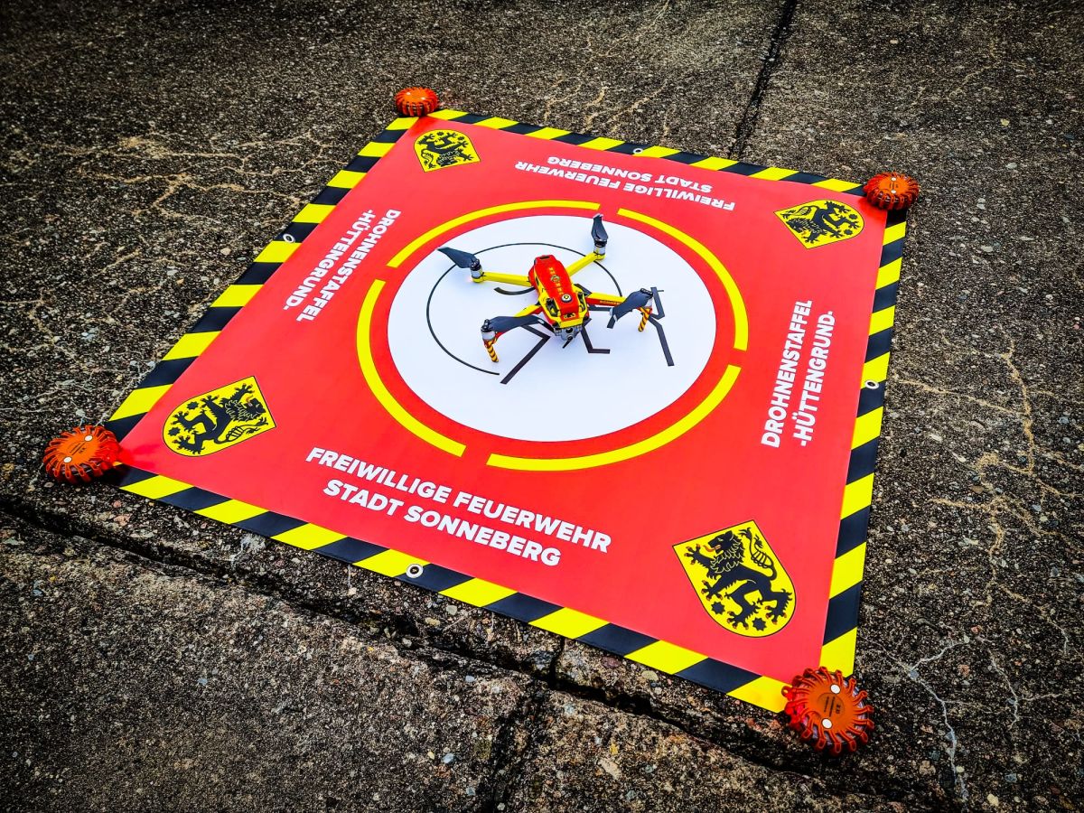 Vier selbstheizende Akkus stellen insgesamt eine Flugzeit von 60 Minuten am Stück sicher. Auf einer eigens angefertigten Sonneberger „Landeplane“ mit dem Sonneberger Reiterlein hat die Drohne einen im Gelände gut sichtbaren Start- und Landeplatz. Zurzeit hat die Feuerwehr Sonneberg drei komplett ausgebildete Drohnenführer und vier weitere Kameraden, die die Drohne im Einsatzfall betreiben können. Zwei Anschaffungen seien laut Stadtbrandmeister nun noch zur optimalen Auswertung der Luftaufnahmen geplant – eine Ladefunktion für die Drohne im entsprechenden Feuerwehrfahrzeug sowie ein großer Bildschirm zur sofortigen Wiedergabe.