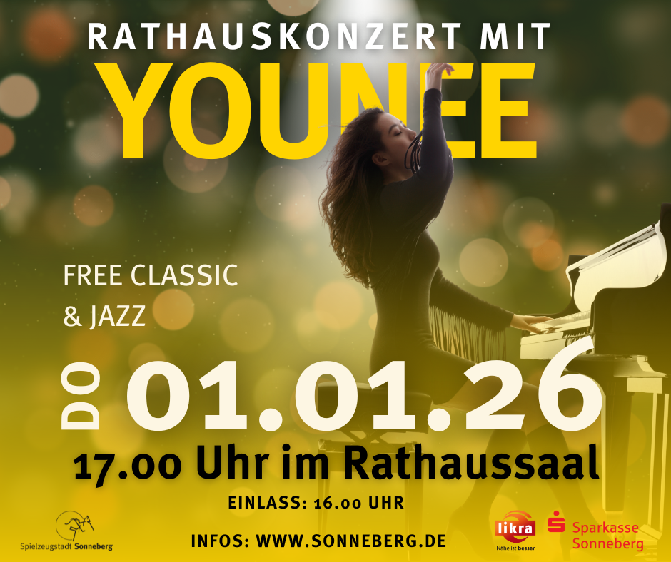 Die Stadt Sonneberg lädt herzlich zu diesem besonderen musikalischen Auftakt in das neue Jahr ein. Ein Konzert, das nicht nur Fans klassischer Musik, sondern auch Jazzfreunde und neugierige Entdecker begeistern wird – denn kein Abend mit YOUNEE gleicht dem anderen.