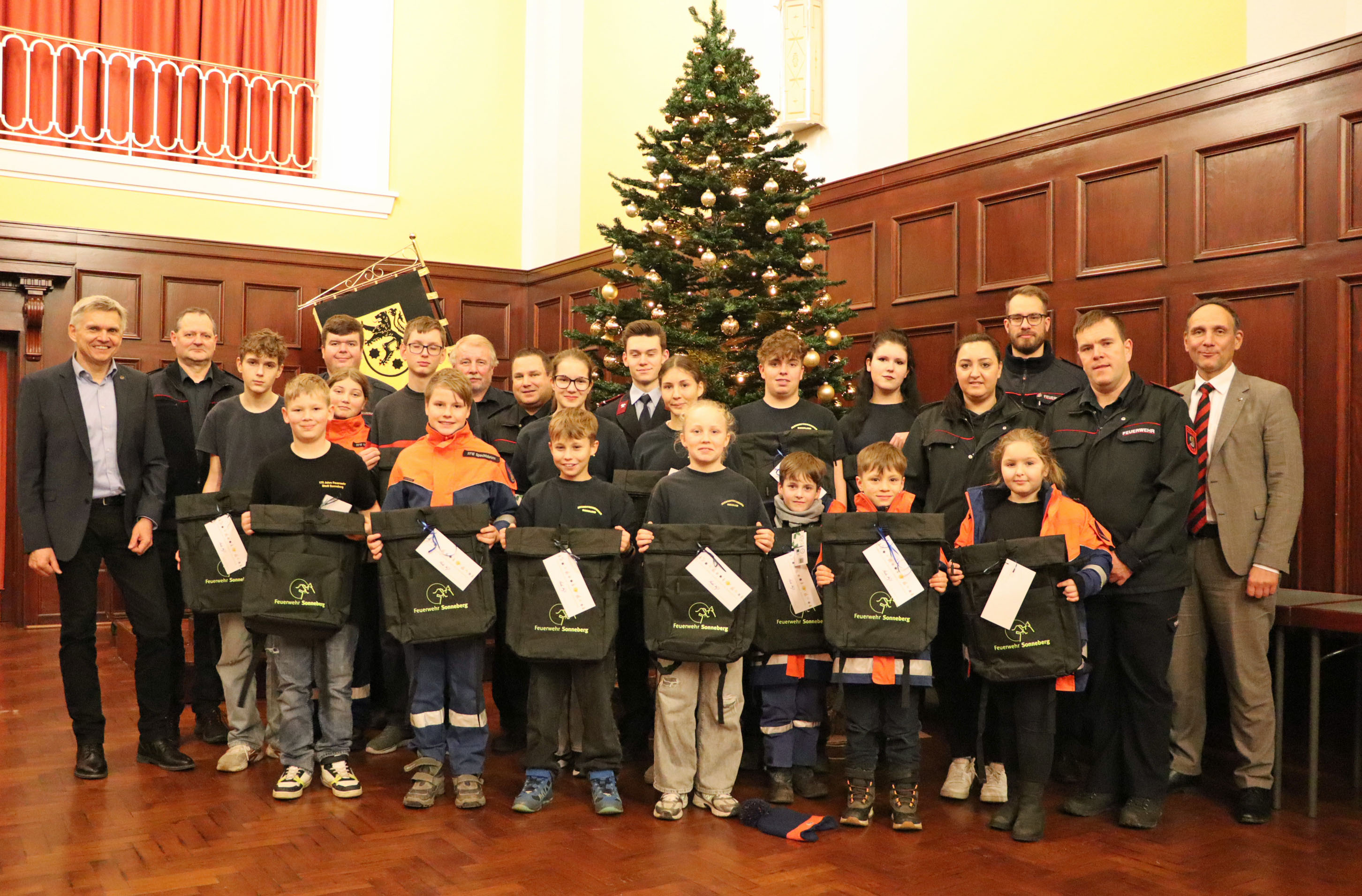 Feuerwehr-Besuch im Rathaus? Das gab’s am Donnerstag vor Weihnachten aus einem freudigen Anlass. Eingeladen waren die Jugendwarte der Sonneberger Feuerwehren samt einigen aktiven Kindern und Jugendlichen, um ein besonderes Geschenk an sie zu übergeben. Alle Mädchen und Jungen, die in einer Jugendfeuerwehr im Stadtgebiet engagiert sind, erhielten von Sonnebergs Bürgermeister Dr. Heiko Voigt einen eigens angefertigten Rucksack mit dem Reiterlein und dem Schriftzug „Feuerwehr Sonneberg“ in Neon-Gelb.