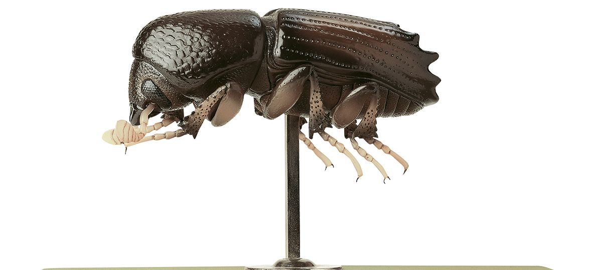 Hier siehst du das SOMSO-Modell des großen achtzähnigen Fichtenborkenkäfers (Ips typographus L.) im vergrößerten Maßstab 1:40.