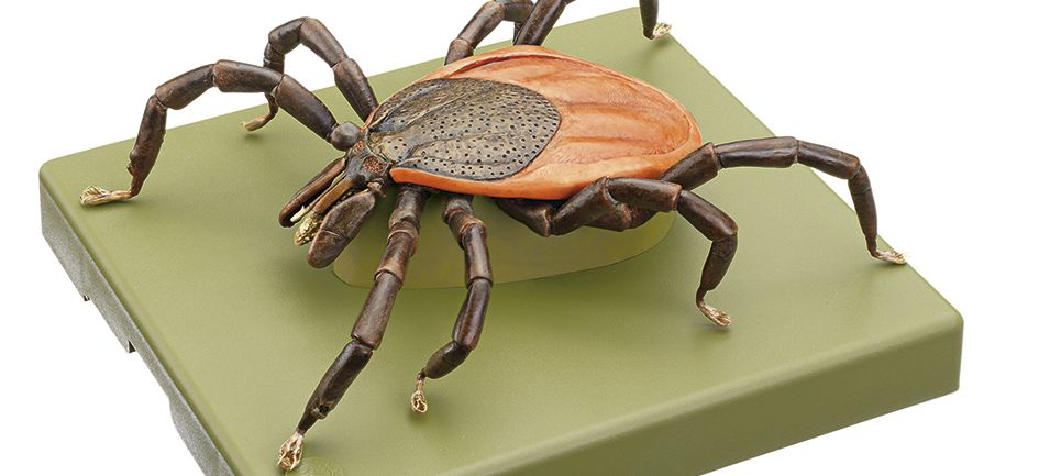 Hier siehst du das SOMSO-Modell des Gemeinen Holzbocks (lxodes ricinus, Weibchen) im vergrößerten Maßstab 1:75.