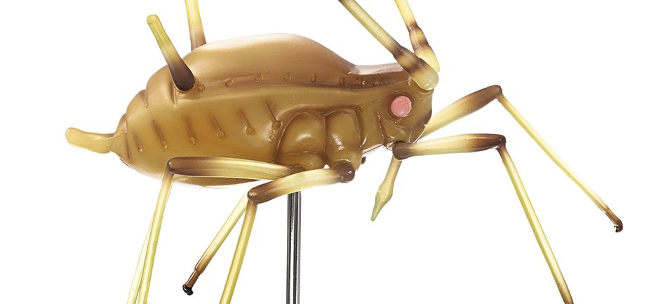 Hier siehst Du das SOMSO-Modell einer ungeflügelten Großen Rosenblattlaus (Macrosiphum rosae, nach Dr. E. Schicha) im vergrößerten Maßstab 1:80.