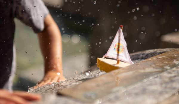 Ein wahres Paradies für kleine Entdecker! Stell Dir vor: An heißen Sommertagen könnt ihr hier planschen, spritzen und euch nach Herzenslust abkühlen. Wasser ist einfach ein Element, das Kinder fasziniert. Erkennt ihr, dass der Wasserspielplatz wie ein zu groß gewordener Baukasten aussieht?
