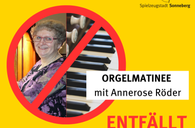 Aus gesundheitlichen Gründen muss die geplante Orgelmatinee im Sonneberger Rathaus mit Annerose Röder an diesem Donnerstag, 8. Mai 2025 leider entfallen.