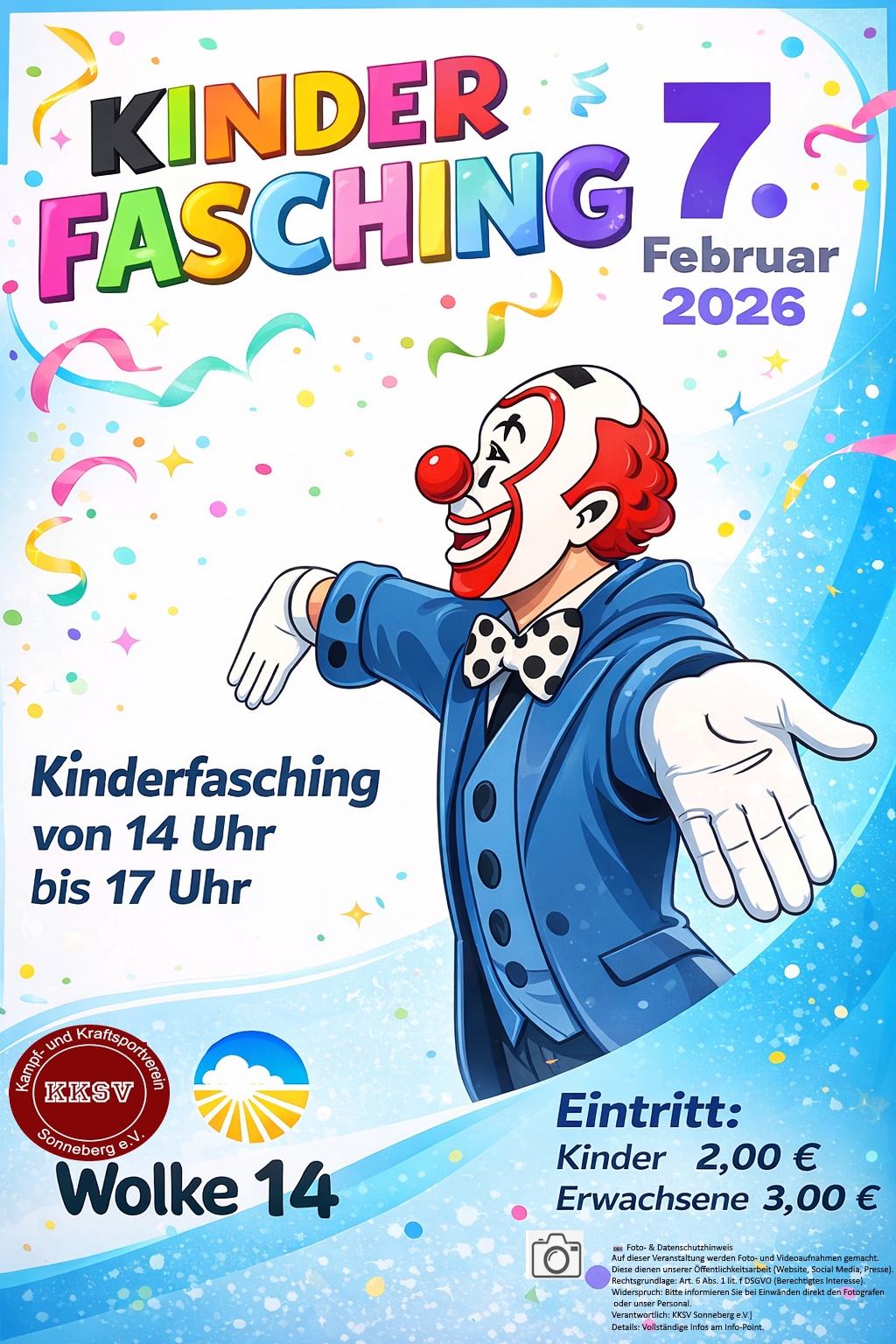Bei uns in der Wolke 14 steigt am Samstag, dem 7. Februar 2026 von 14:00 bis 17:00 Uhr wieder der große Kinderfasching. Prinzessinnen und Meerjungfrauen werden auf Piraten, Zauberer und andere Figuren treffen. Mit großer Unterstützung durch den KKSV Sonneberg e.V. wird es wieder ein buntes Programm mit Musik, lustigen Spielen und Tanzdarbietungen geben. Für das leibliche Wohl wird ebenfalls bestens gesorgt. Der KKSV Sonneberg e.V. und das Team der Wolke 14 freuen sich auf alle kleinen und großen Närrinnen und Narren.
